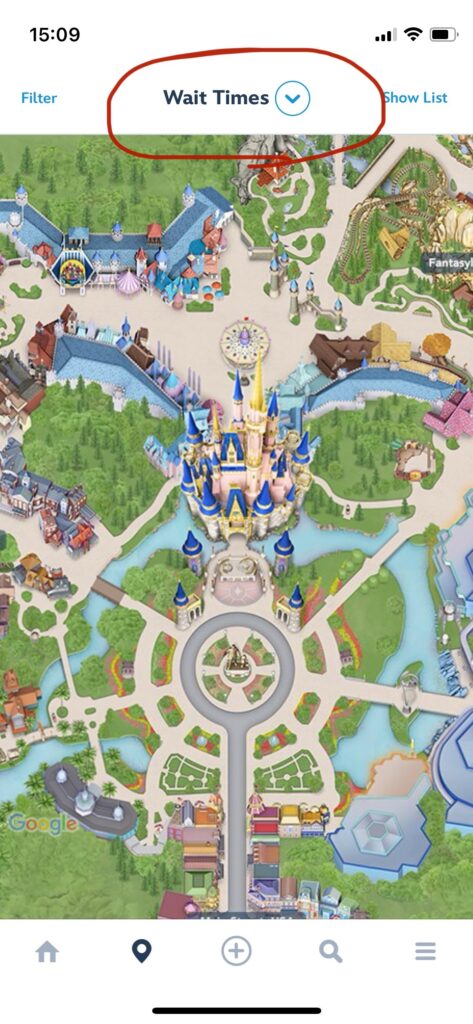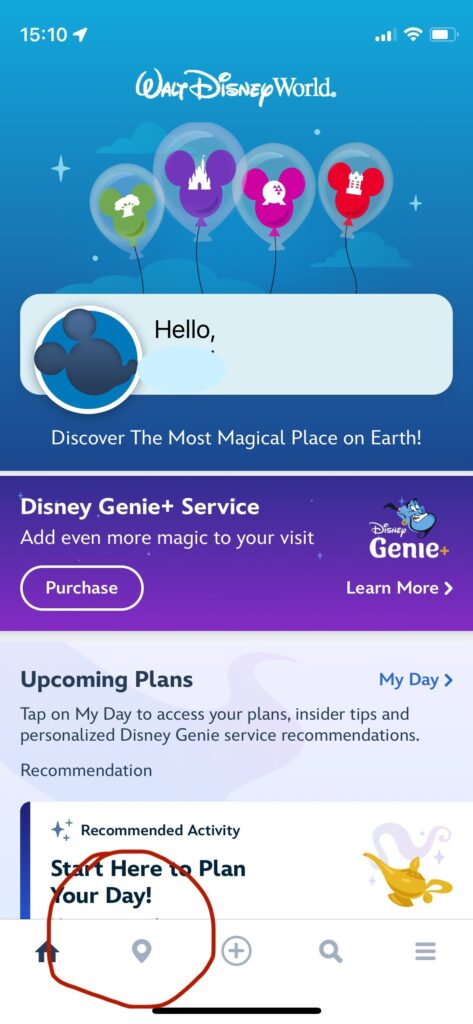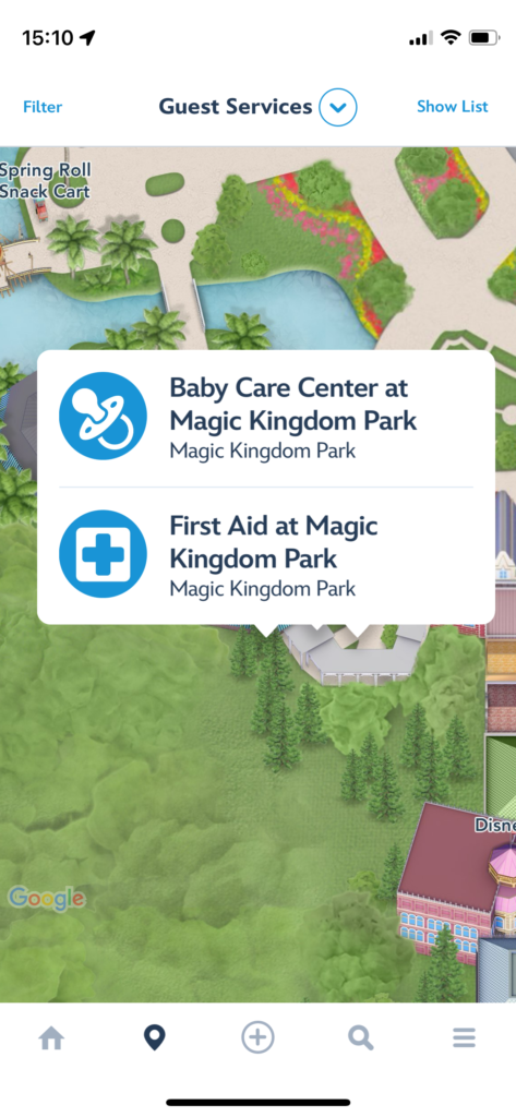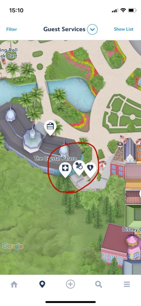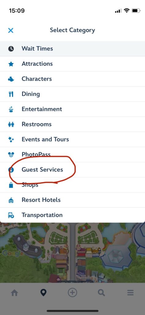 アプリでも場所の確認ができます。ホームボタンの隣のマークを押し、Select CategoryでGest Services を選択するとFirst Aid は十字架マークで表示されています。