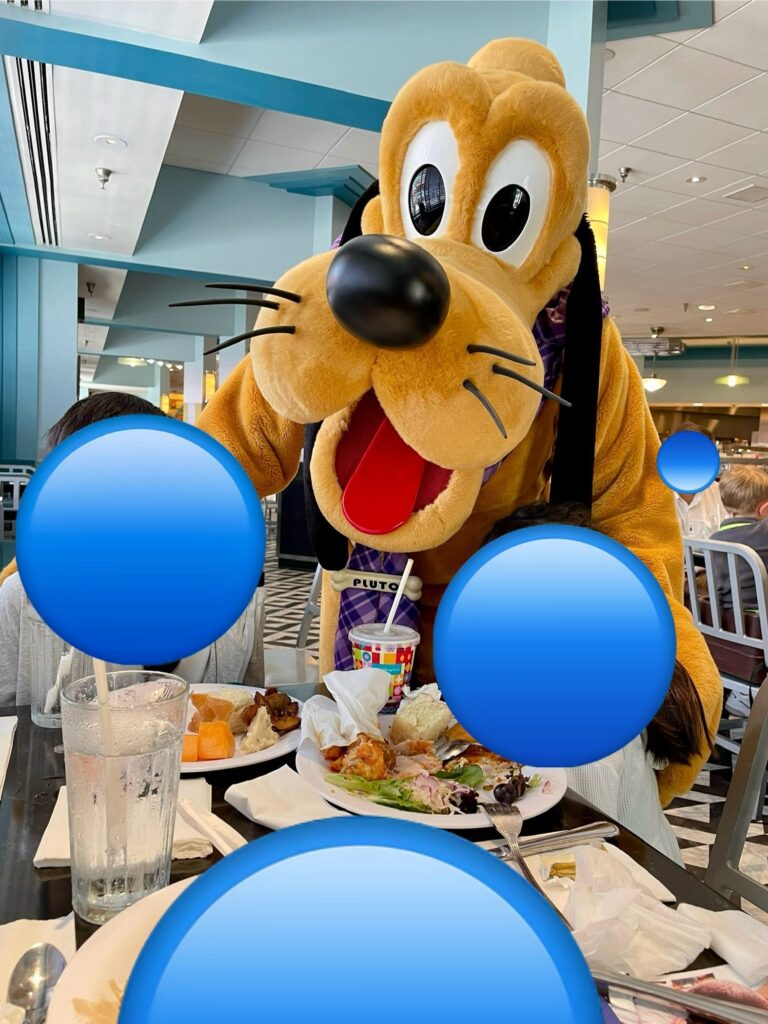 ハリウッド&バインにてランチをいただきました。少し遅めの時間だったためか満席ではなかったのでかわいいキャラクター達が何度もテーブルに来てくれました。ブッフェ形式のレストランなので、お食事を取りに行ったりキャラクターと触れ合ったりと忙しくも楽しい時間を過ごせました。