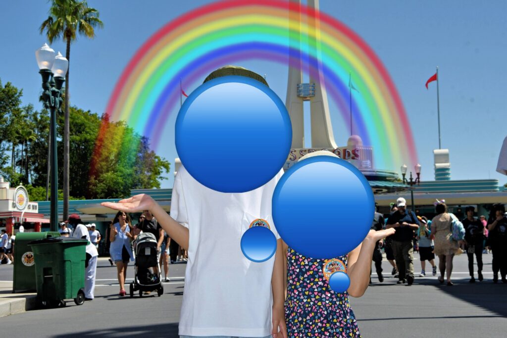 パークに入るとフォトパスのカメラマンさんがメインストリートに待機していたので、さっそく撮影してもらいました。英語の話せない子供たちにもカメラマンさんに優しく指導してもらってポーズを決めて写真撮影。このポーズは何?と内心親は思っていましたが、携帯に送られてきた写真を見たら虹が!なんとも素敵な写真になっていました。初めてのカメラマンさんによる写真撮影は緊張していたのか硬い表情。ですが何日も何枚も撮ってもらううちに慣れてきて、指導通りのポーズや表情づくりまでぐっと上手くなってゆく子供たちでした。