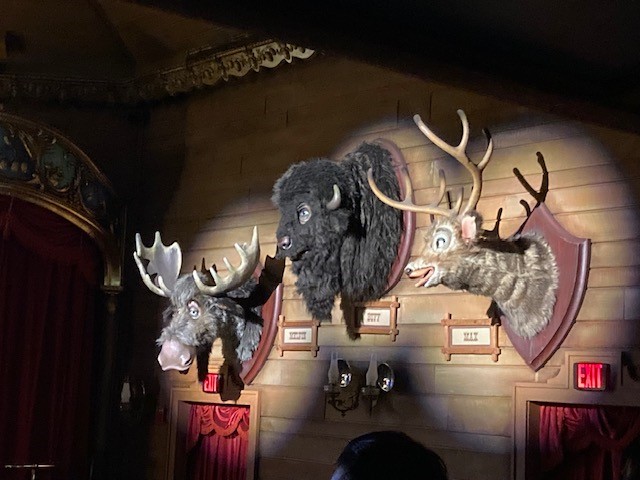 まず目に飛び込んでくるのは、存在感を放つ『グリズリー・ホール』の大きな幕。その後、シアターの右手にはお馴染みのシカのマックス、バッファローのバフ、そしてヘラジカのメルビンが待ち構えています。訪れた際には、ぜひ彼らにも注目してみてください。