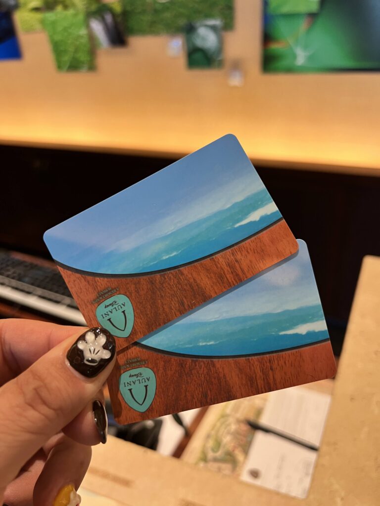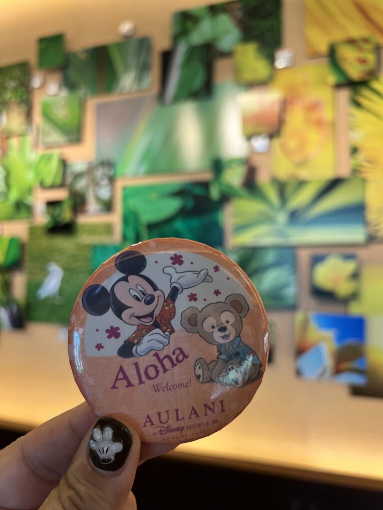 チェックインのとき、キャストさんが微笑みながら手渡してくれたのは、アウラニらしいデザインの缶バッジ。リゾートの雰囲気を映したその小さなアイテムは、ただのノベルティ以上に「旅の始まりの記念品」として胸に残ります。