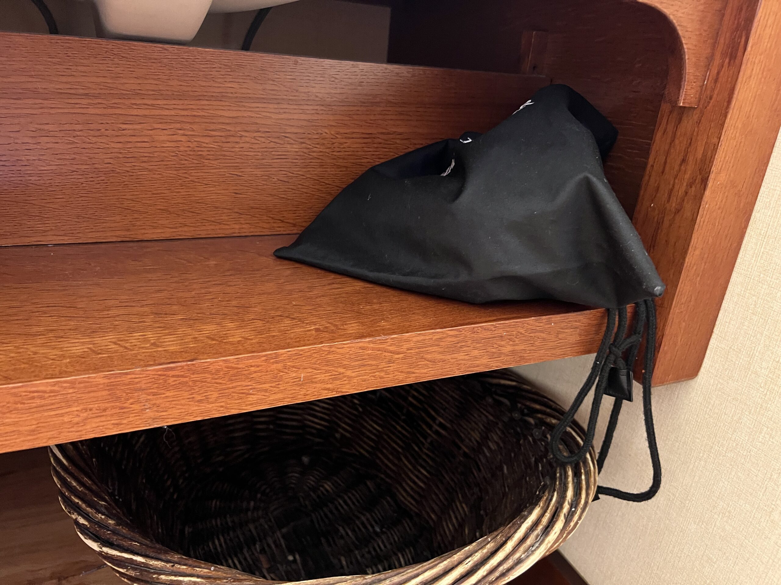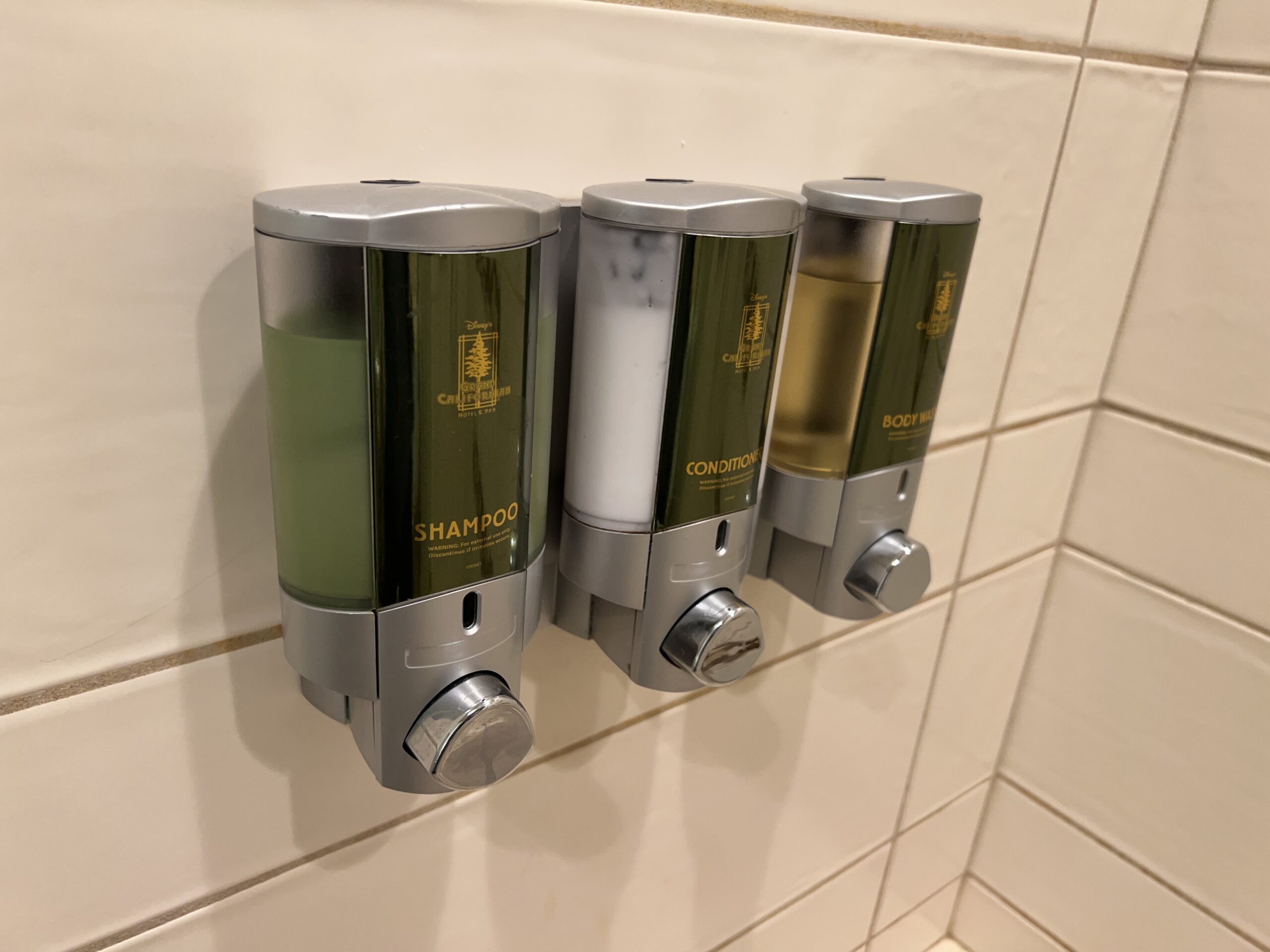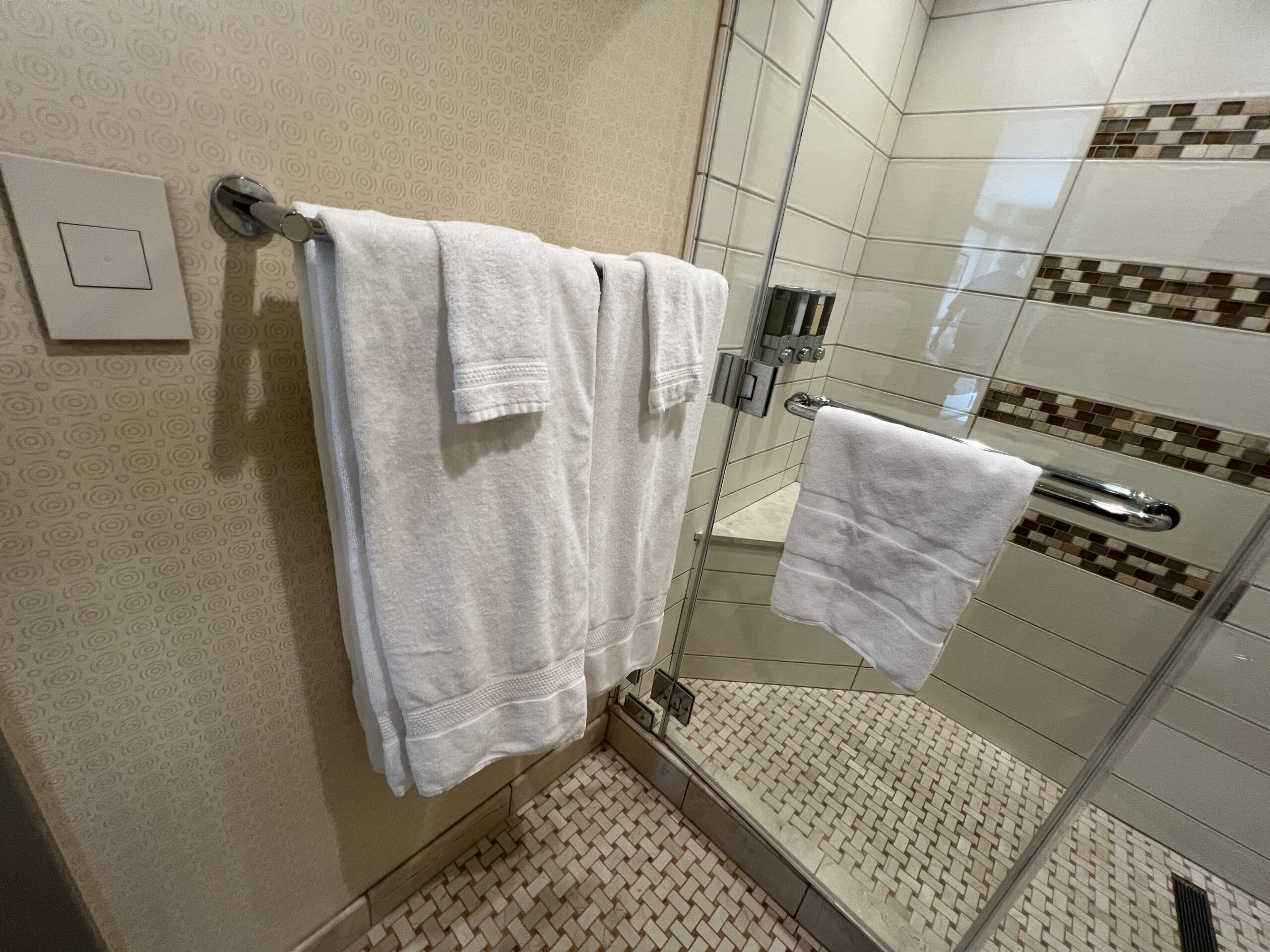 今回のお部屋にはバスタブはなく、ガラス扉で仕切られたシャワールームがあります。壁には段差が設けられていて、座ったり荷物を置いたりできて便利です。レインシャワーと手持ち可能なシャワーの両方があり、使い勝手が良いのもポイントです。