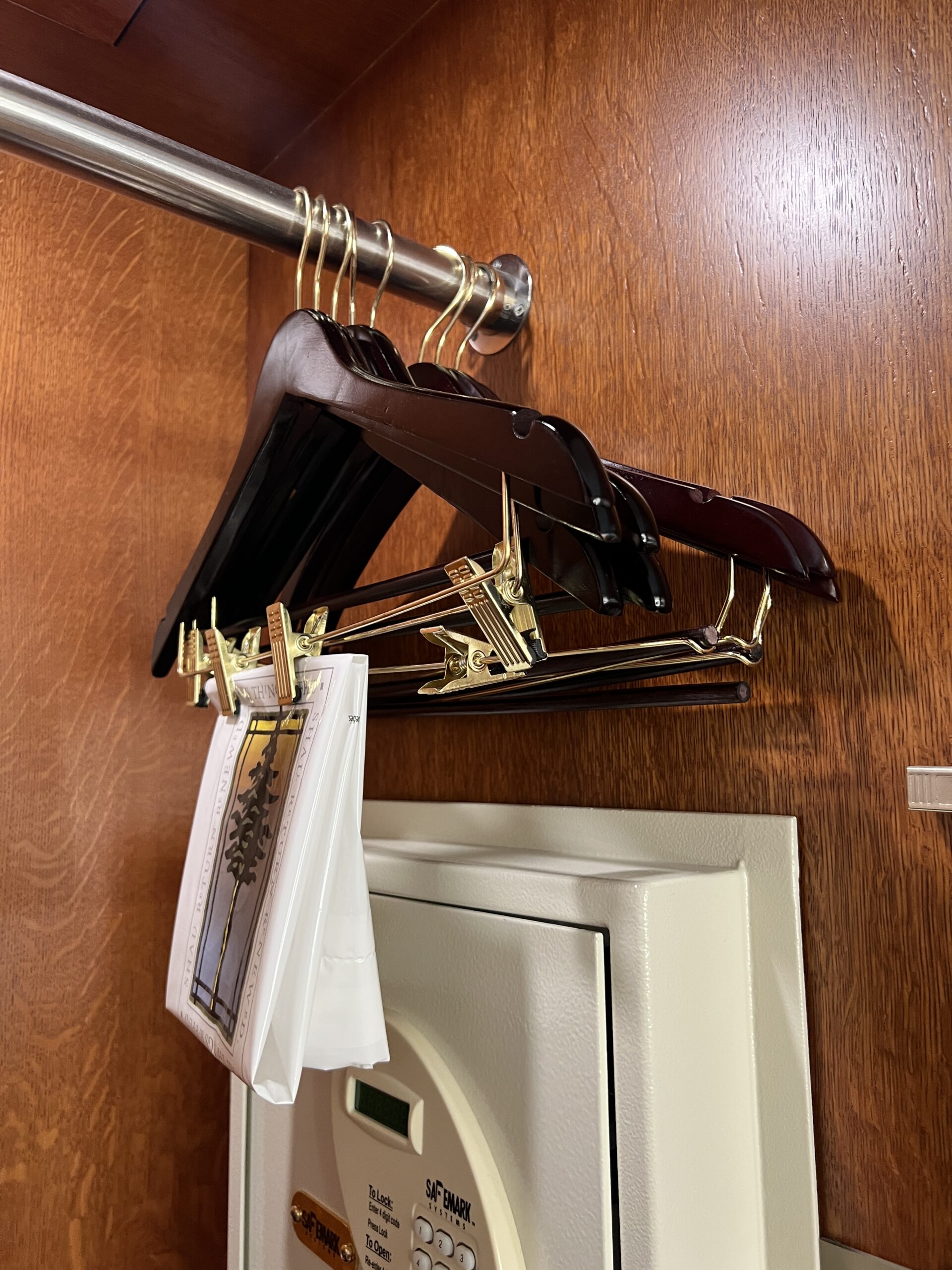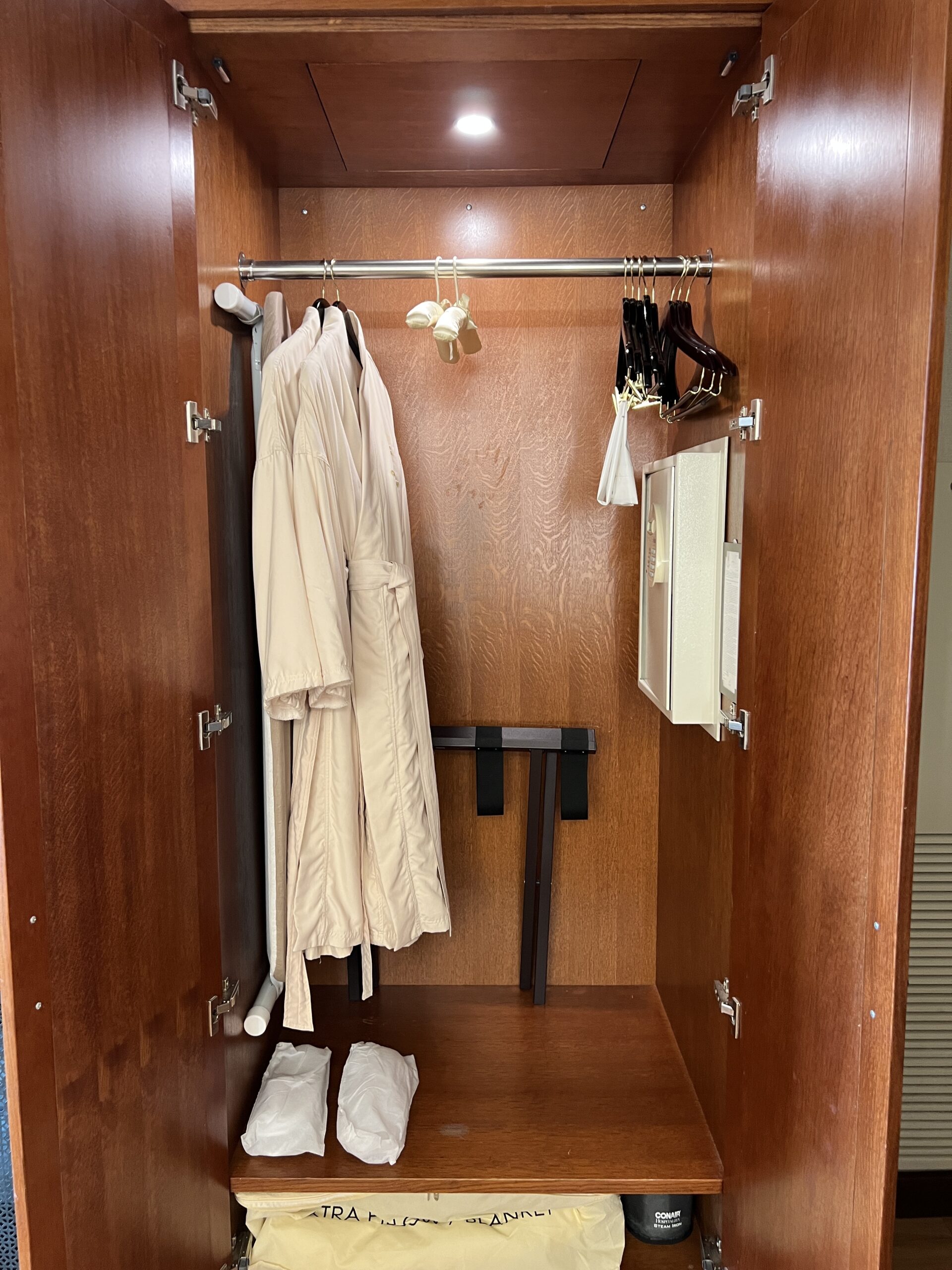 バスルーム向かいには全身をチェックできる大きなミラー付きのクローゼットがあります。扉を開けると、バスローブやハンガーが整然と並び、下には予備の枕やブランケット、アイロンとアイロン台、セーフティーボックスも備えられています。長期滞在や荷物が多いときにも安心です。