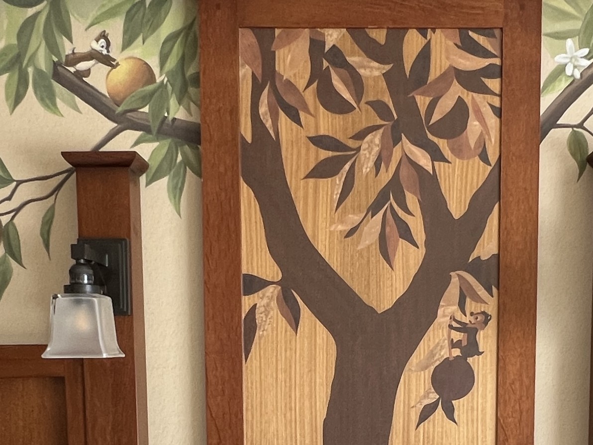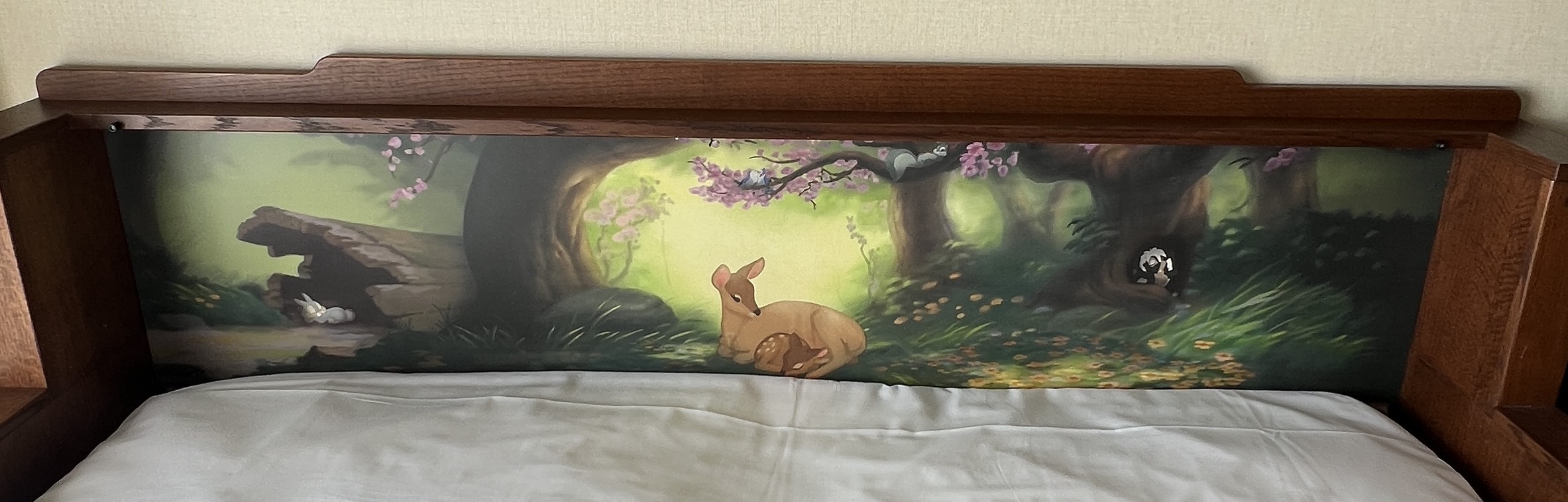 まずはベッドエリアからご紹介します。ヘッドボードの装飾にはオレンジの木やかわいいディズニーキャラクターが隠れていて、シンプルながら遊び心を感じるデザインになっています。