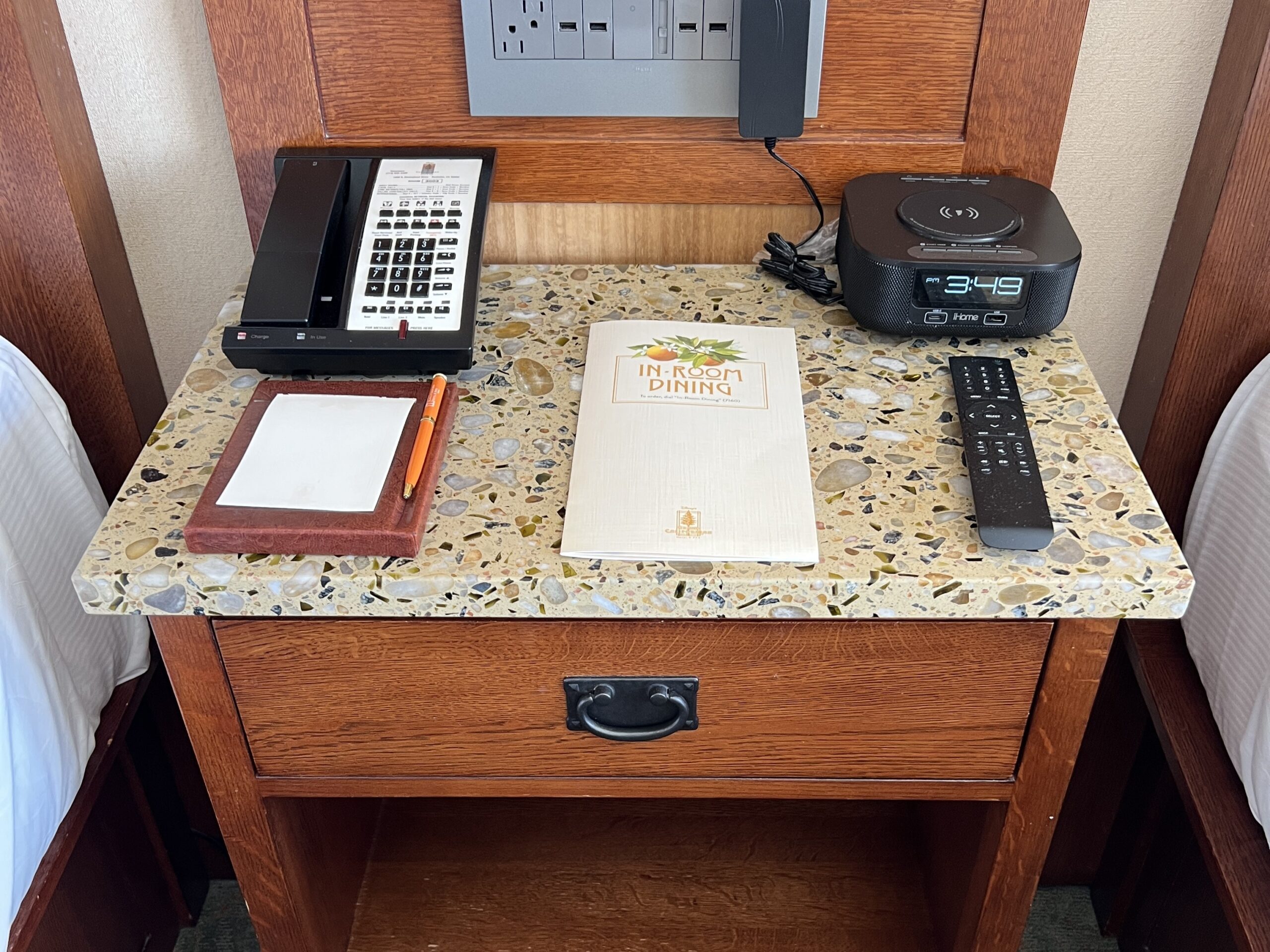 ベッドの間にはナイトスタンドが置かれていて、目覚まし時計や電話、イン・ルーム・ダイニングのメニュー、メモ帳などが備えられています。さらに、上部には複数のコンセントとUSBポートがあり、スマホやデバイスの充電にとても便利です。