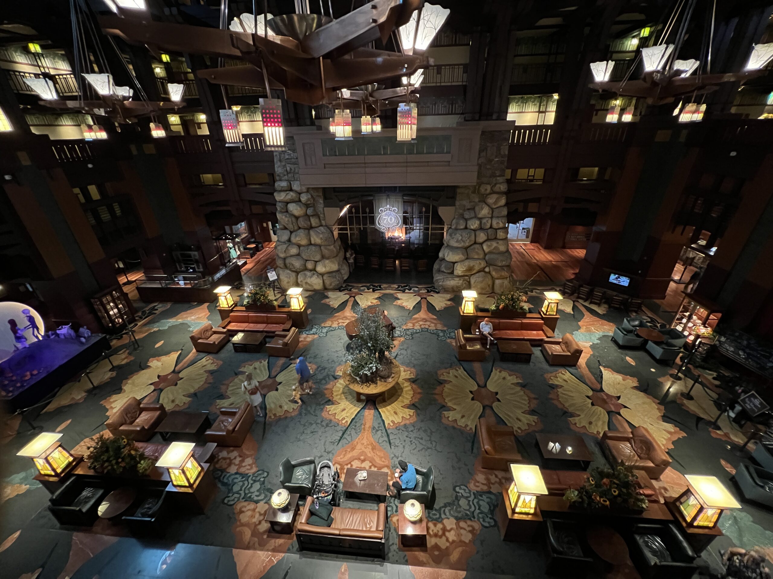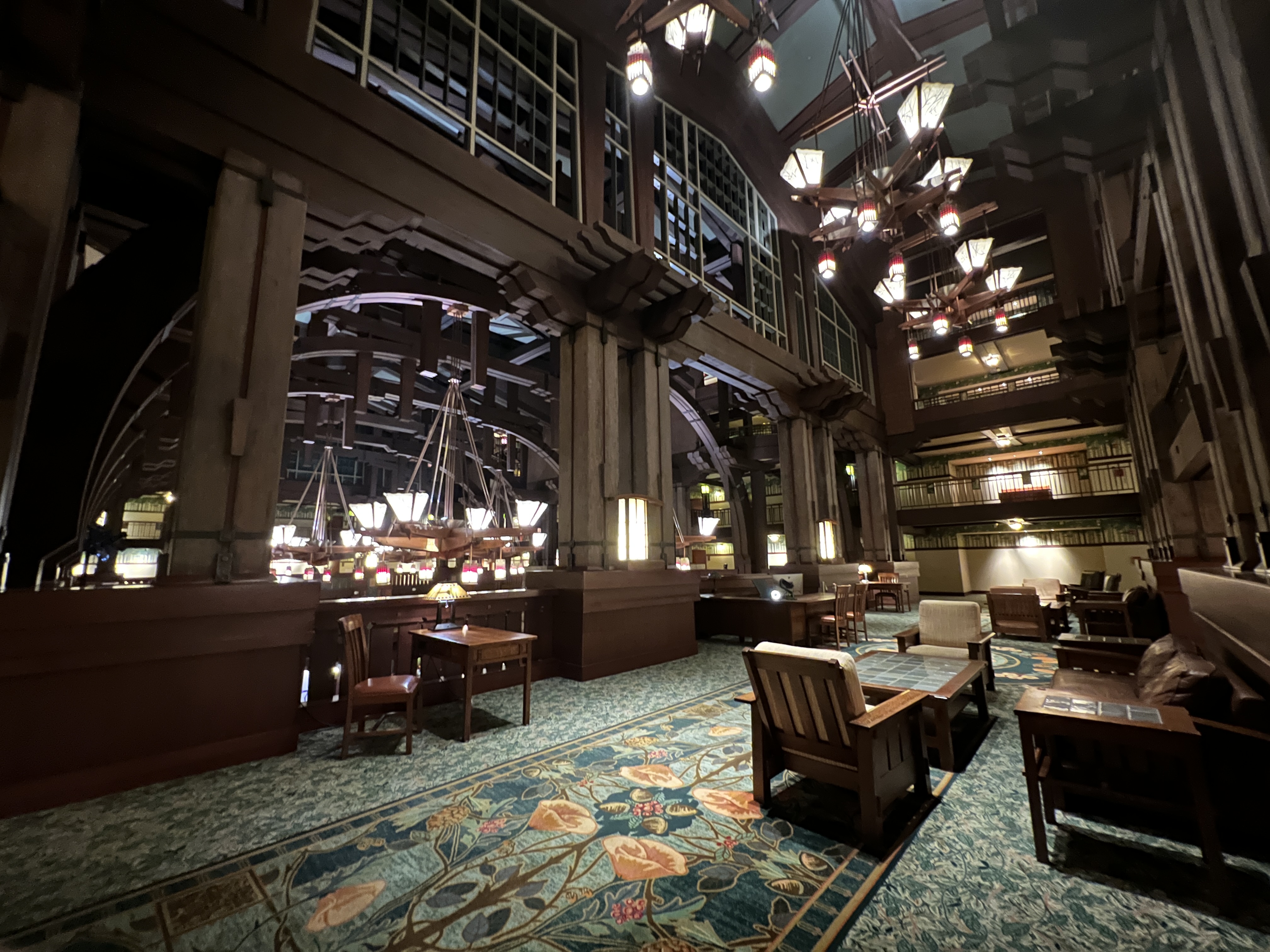 ディズニー・グランド・カリフォルニアン・ホテル&スパといえば、木のぬくもりあふれる巨大なロビーが象徴的です。高い天井と大きな梁、あたたかな照明に包まれて、まるで山のロッジに来たかのよう。