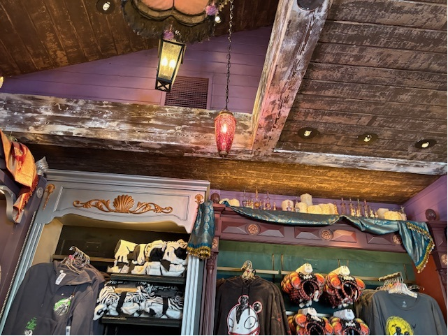 ショップではホーンテッドマンションやティムバートンの「ナイトメア・ビフォア・クリスマス」をテーマにしたアパレル、アクセサリー、ホームデコなどのグッズが販売され、なんとも不気味なグッズを多数取り揃えています。