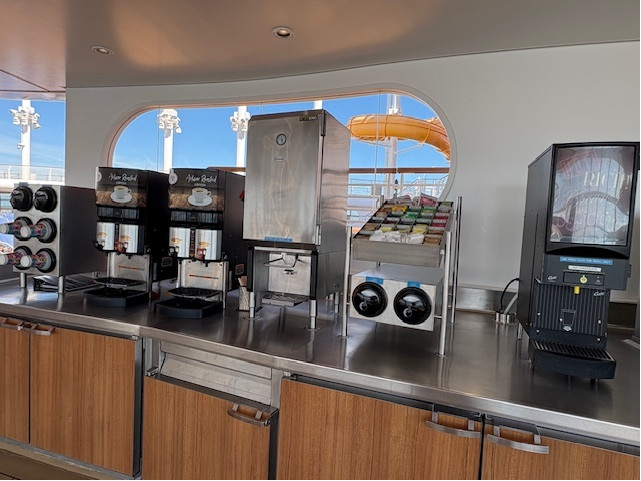 24時間オープンしているので、好きな時にソフトドリンク飲み放題です!クルーズ中は活用くださいね。台によって少しラインナップが変わる場合があります。お水だけですとデッキ4の外デッキにもウォーターステーションもあります。