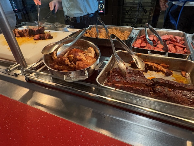 バーベキュー好きにはたまらない!BBQカウンターでは、ジューシーなお肉がたっぷり楽しめます。味が濃いめのプルドポーク、チキン、リブなど、それぞれが食べ応え抜群!付け合わせには、ほんのり甘くてカリッとしたスイートポテトフライや彩り豊かな野菜もあり、バランスもばっちりです。