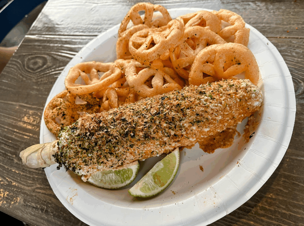唐辛子マヨネーズ、ケソフレスコ、ふりかけなどがかかったトウモロコシ。ちょっと食べづらいですが、ぜひ食べていただきたい1品。