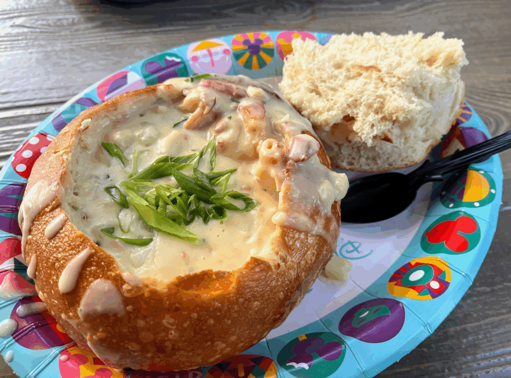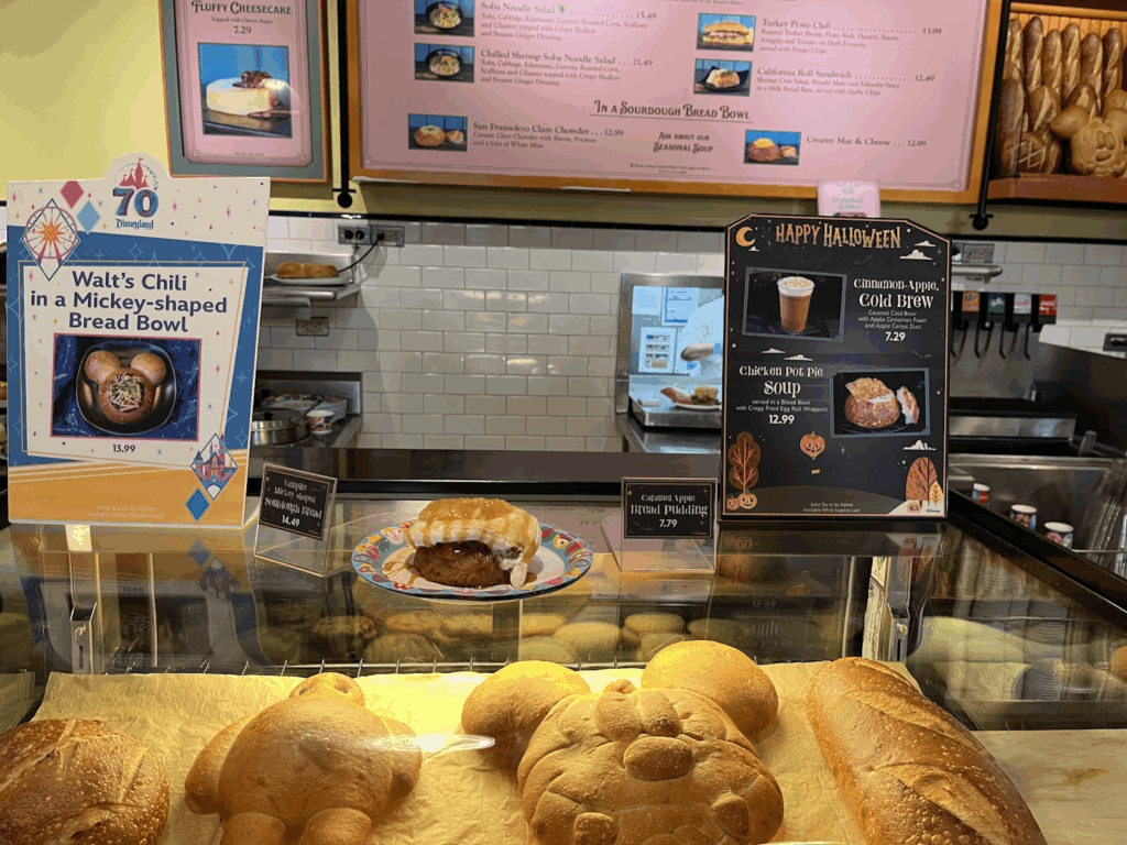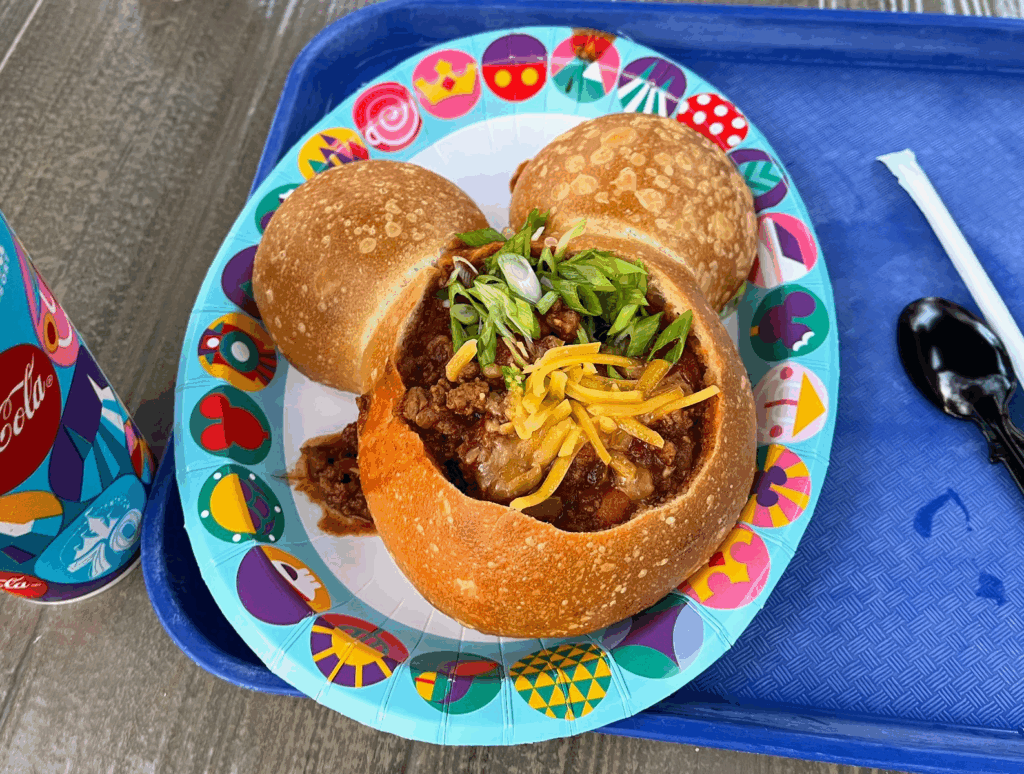 70周年記念メニューもありました。ウォルト・ディズニーの好物として知られるチリを、ミッキー型のブレッドボウルににたっぷり詰めたメニュー。見た目も100点ですね!