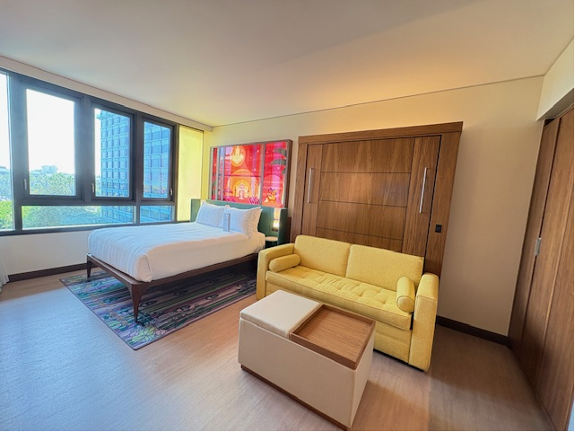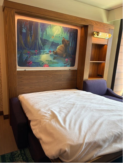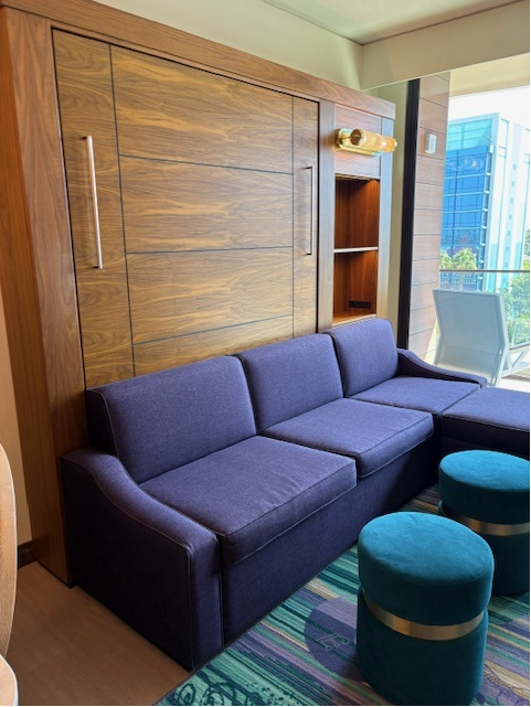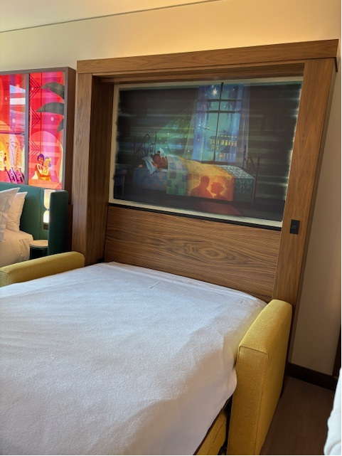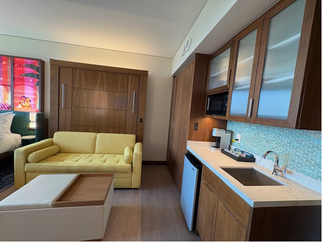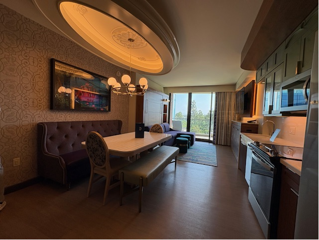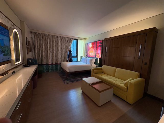 今回見学したお部屋は「プリンセスと魔法のキス」がテーマ!広々としたリビングにはソファ、テレビ、ダイニングテーブル、そして壁の中にはクイーンサイズのマーフィーベッド(収納ベッド)が隠れています。インテリアは上品ながらも、ディズニー映画をモチーフにしたアートや照明が温かく迎えてくれます。