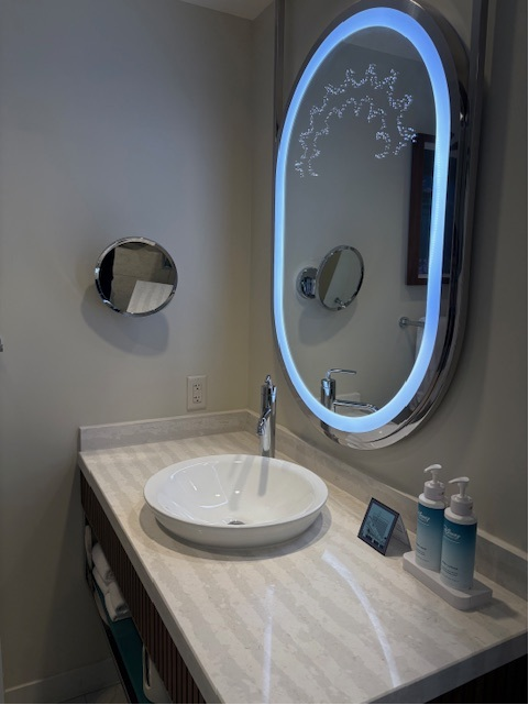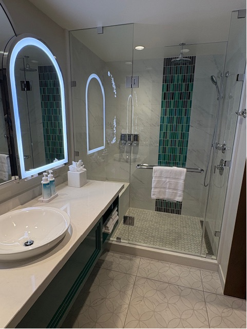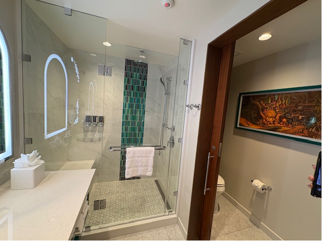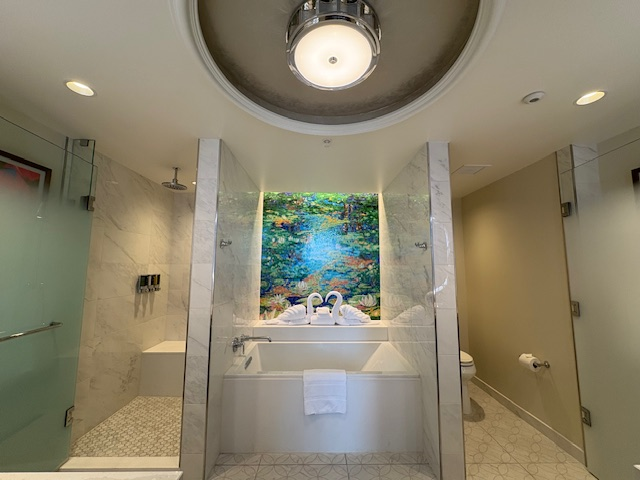 バスルームはこんなに広い!シャワーとバスタブが別々になっていて、ゆったりと過ごせそうです。鏡にはルイスやレイが描かれていたりと、細部まで「探す楽しみ」を忘れさせないディズニーらしさ!