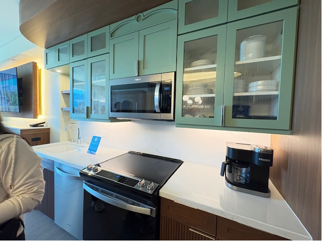 フルサイズのキッチンが備え付けられていて、冷蔵庫、コンロ、電子レンジ、食洗機、コーヒーメーカーなどがフル装備。「ホテルなのに、ここでちゃんと料理できる!」という驚き。朝食を簡単に用意したり、家族旅行には便利な空間になっています。