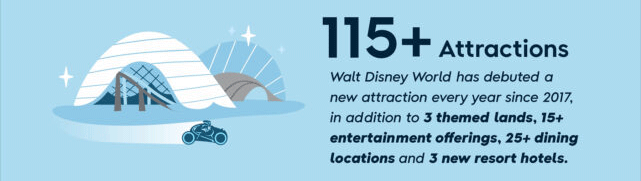 115以上のアトラクション!ウォルト・ディズニー・ワールドは2017年以来、ほぼ毎年新しいアトラクションが誕生しており、それに加えて3つのテーマランド、2つの新しいエンターテイメント施設、6つの新しいダイニングロケーション、そして3つの新しいリゾートホテルが加わりました。