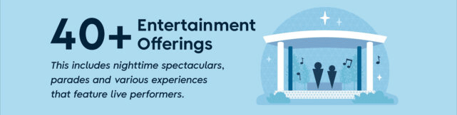 さらに、夜空を彩る花火ショーやライブ演奏など、40以上のエンターテイメントが毎日開催。昼と夜でまったく違う魔法を感じられます。