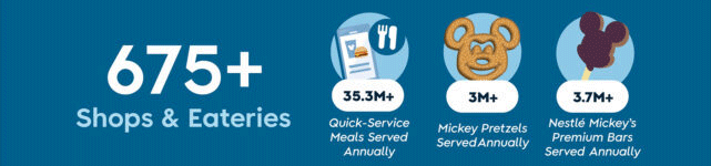 - ディズニーワールドでは毎年、ハンバーガー 1,000 万個、ホットドッグ 600 万個、フライドポテト 900 万ポンド、ポップコーン 30 万ポンド、七面鳥のドラムスティック 160 万本が提供されます。