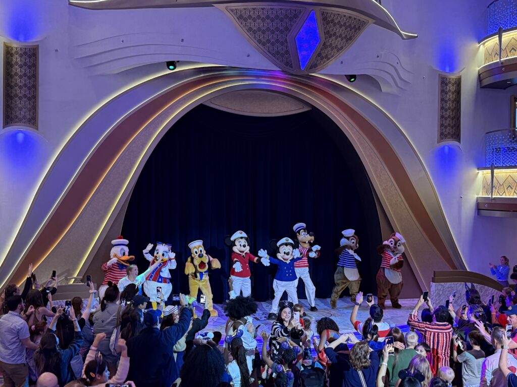 セレモニーに参加したゲストが船に戻るまでグランド・ホールで行われたダンスパーティーを見に行きました。キャラクターがゲストに混ざって踊る楽しいイベントでした。
