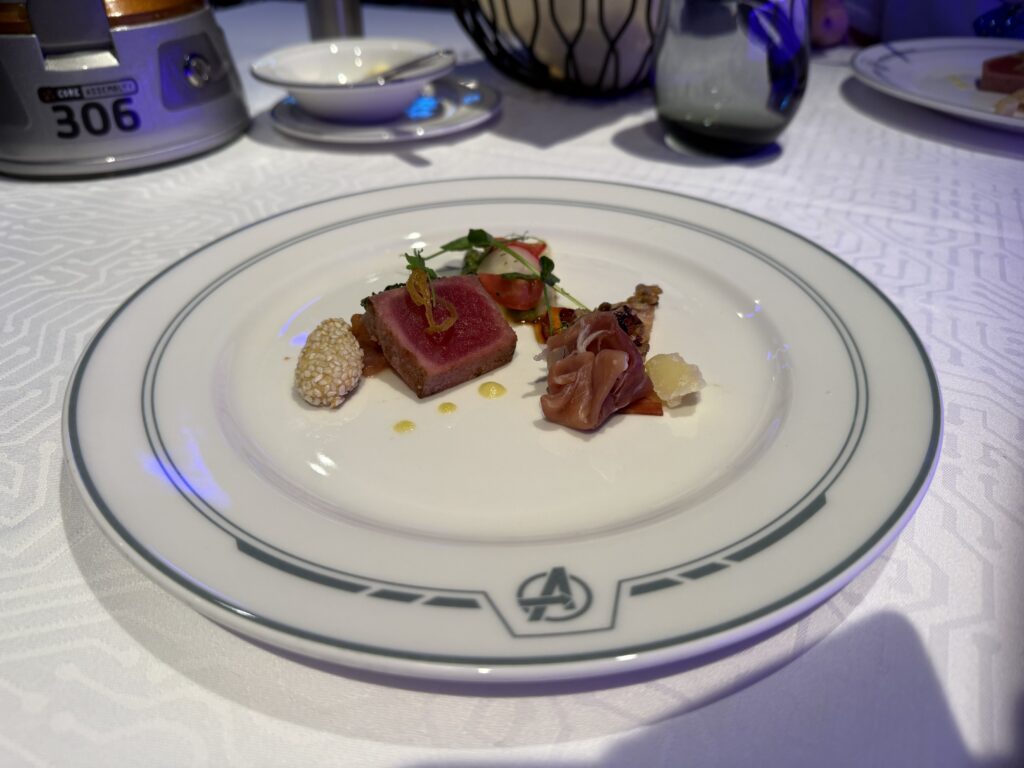 夕食はワールド・オブ・マーベルでしたが、ショーはありませんでした。船内のレストランのメニューが合わさったプレビュー・クルーズならではの特別メニューになっていました。前菜は1923、プライド・ランドとパロ・ステーキハウスのメニューを試せるサンプラーでした。