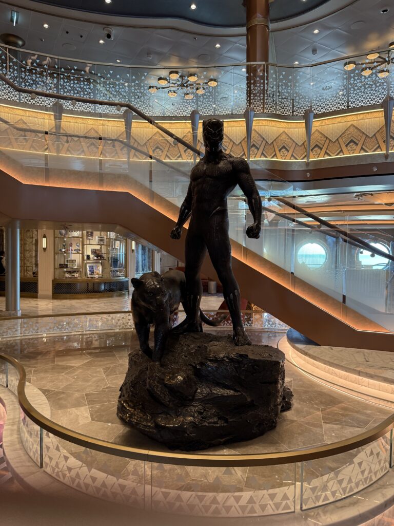 乗船するとブラウンを基調とした落ち着いた雰囲気のグランド・ホールが広がっていました。凛々しくそびえ立つブラックパンサーの銅像に感動しました。