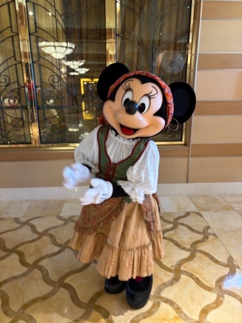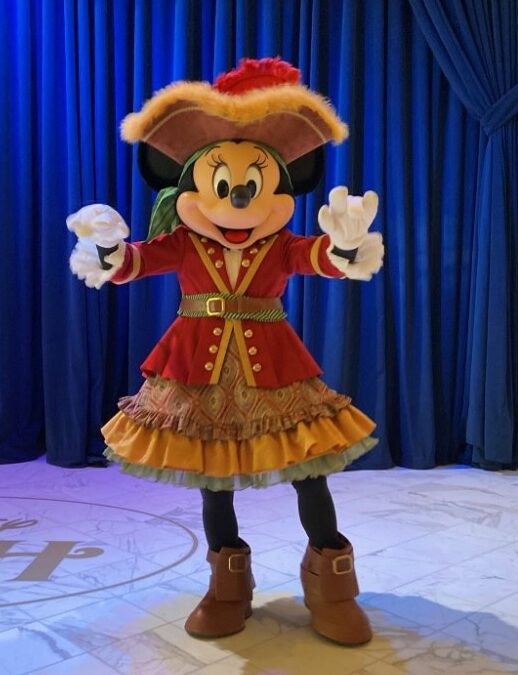 ミニーはこんな可愛い海賊コスチュームで登場!そしてディズニー・ウィッシュ/トレジャー/デスティニーでは、ミニーはキャプテン姿で会いにきてくれます。