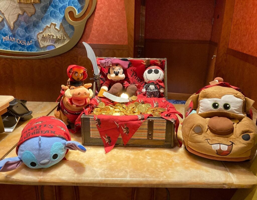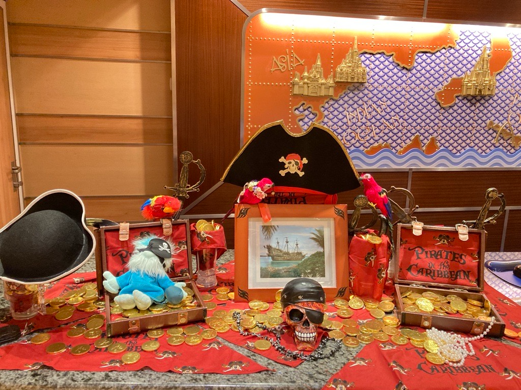 ショップのショーケースもパイレーツ仕様のグッズが前面に飾られ、船によってはゲストサービス・デスクに行けば、こんなデコレーションも!もしかしたら金貨をもらえるかもしれませんよ♪