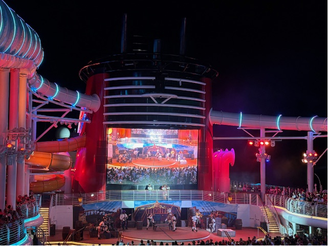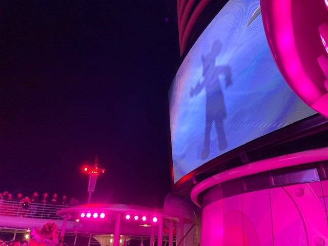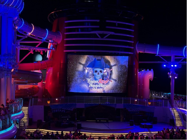 夜遅くにはファネルビジョン(デッキの大型スクリーン)でパイレーツ・オブ・カリビアンの映画が流れることも。夜食にピザを食べながらの映画鑑賞もGOODです!