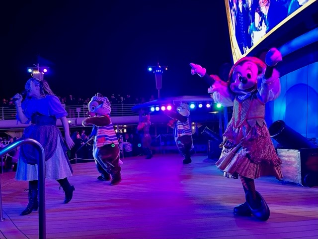 「パイレーツ=海賊」と聞くと、ワクワクしてきませんか?クルーズ中のある晩、船内はまるで海賊船のように変身!ミッキーやその仲間たちは、海賊のコスチュームで登場し、ゲストとのグリーティングや迫力満点のショーで大盛り上がり。