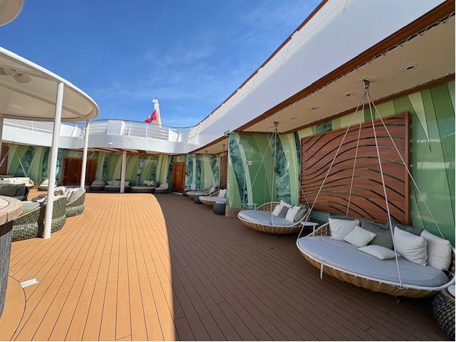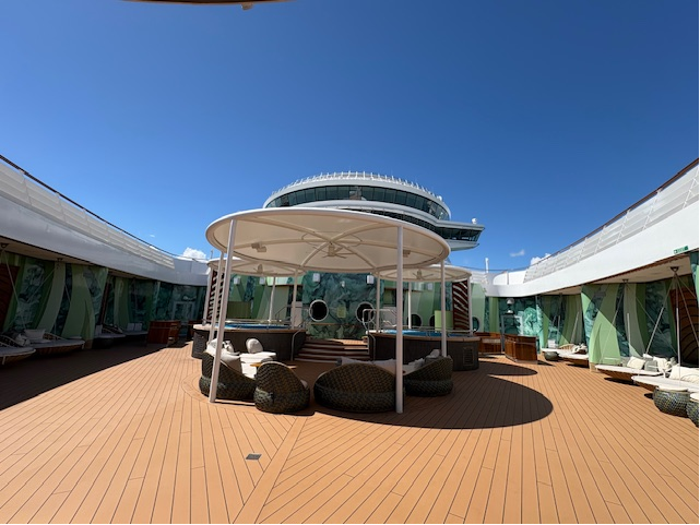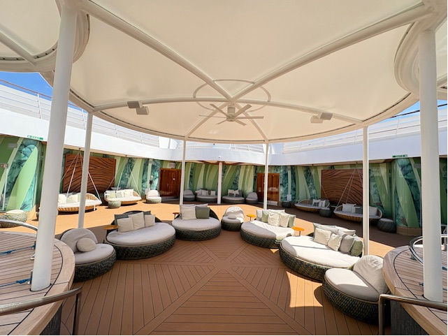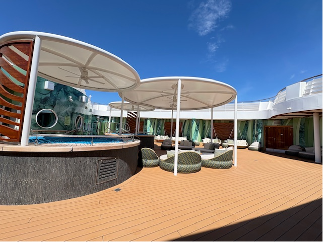 また、屋外には「アウトドア・オアシス Outdoor Oasis」と呼ばれるデッキスペースもあり、ジャグジーに浸かりながら波の音や潮風を感じることができます。リラックスできるこの空間は、船旅ならではの贅沢なひとときです。