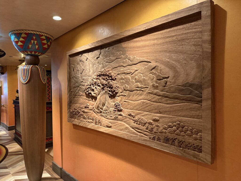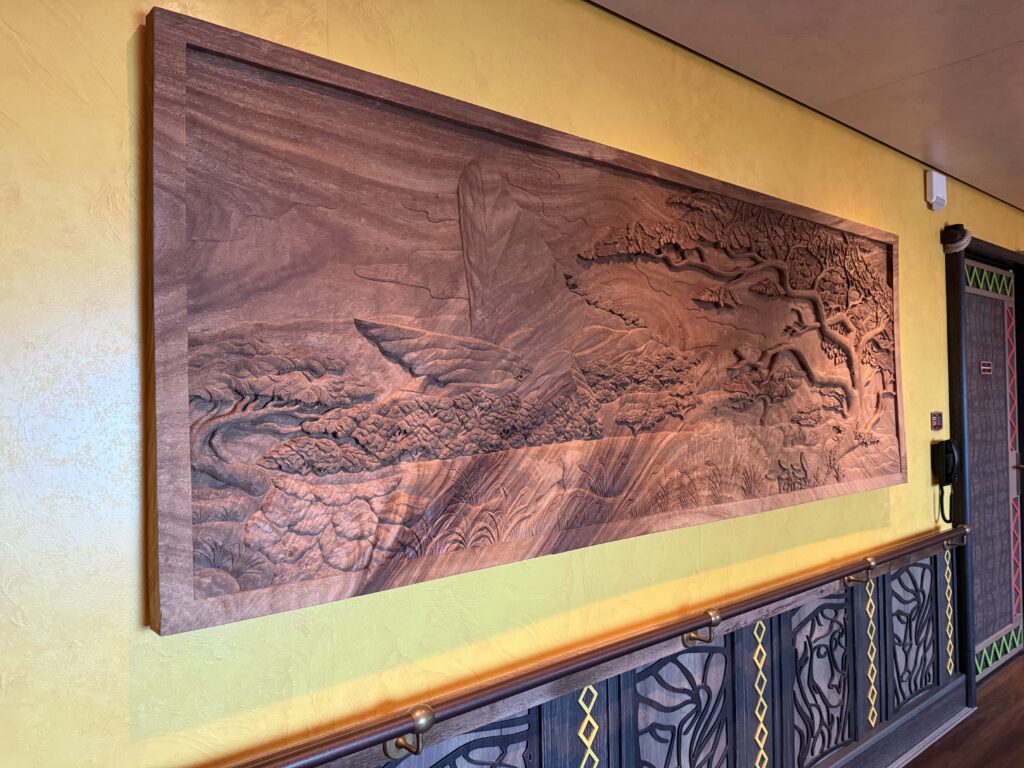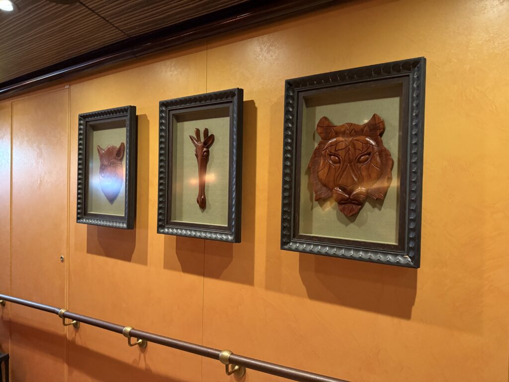 レストランへ続く長い廊下には草原が広がっていました。立派な彫刻画など歩きながら見入ってしまうものばかり。日中と夜で雰囲気も異なって感じました。