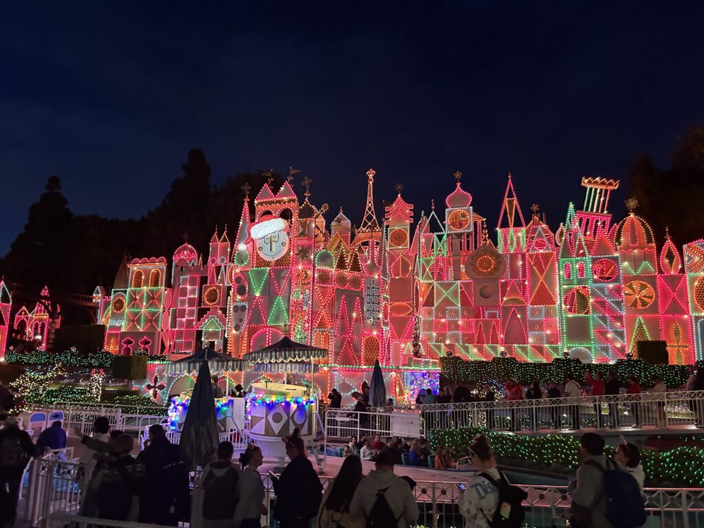 ディズニーランド・パークで私が一番楽しみにしていたのがイッツ・ア・スモール・ワールドのライトアップ。赤や緑とクリスマスカラーでとっても綺麗でした。夜の人混みはものすごかったです。なんとアトラクションの待ち時間は60分。夜の時間帯に乗れるようにライトニング・レーンを取っておいて大正解でした。