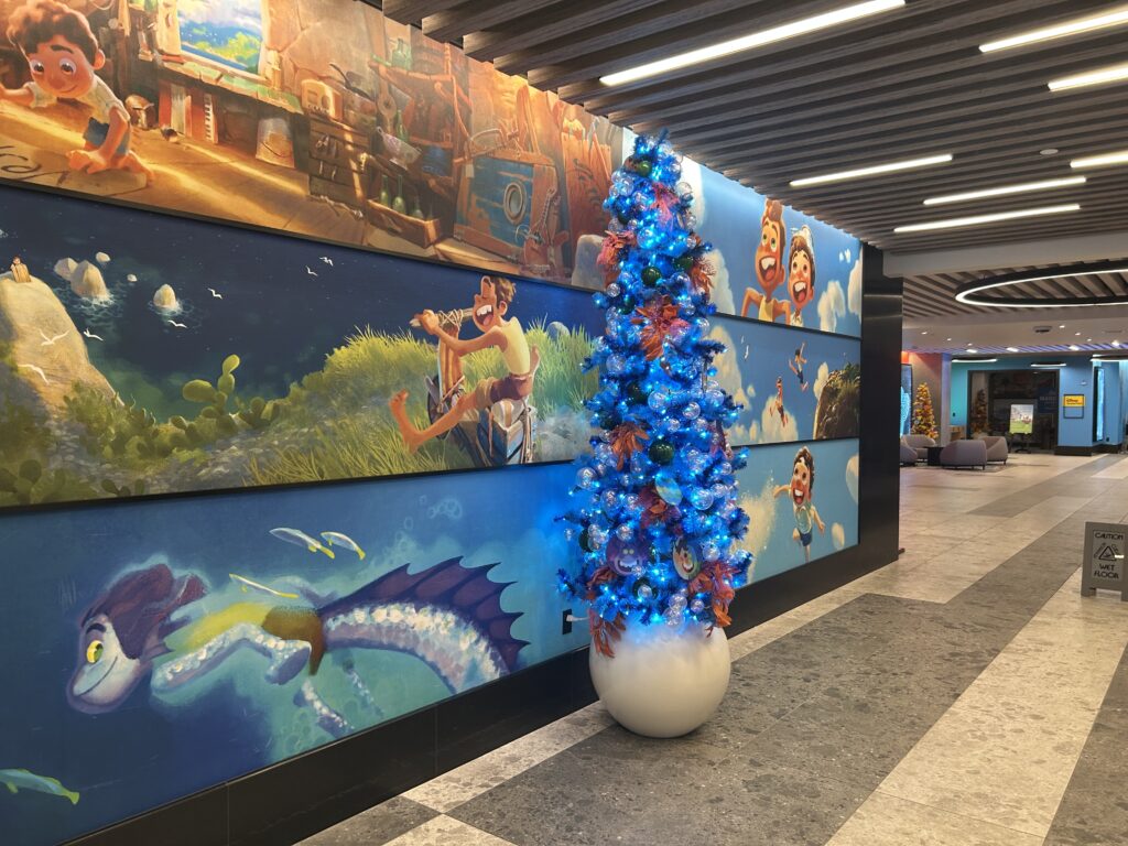 宿泊したピクサー・プレース・ホテルでは、ロビーに早速クリスマスツリーが。赤や青とピクサーらしくカラフルなツリーや装飾でロビーだけでわくわくしちゃいます。