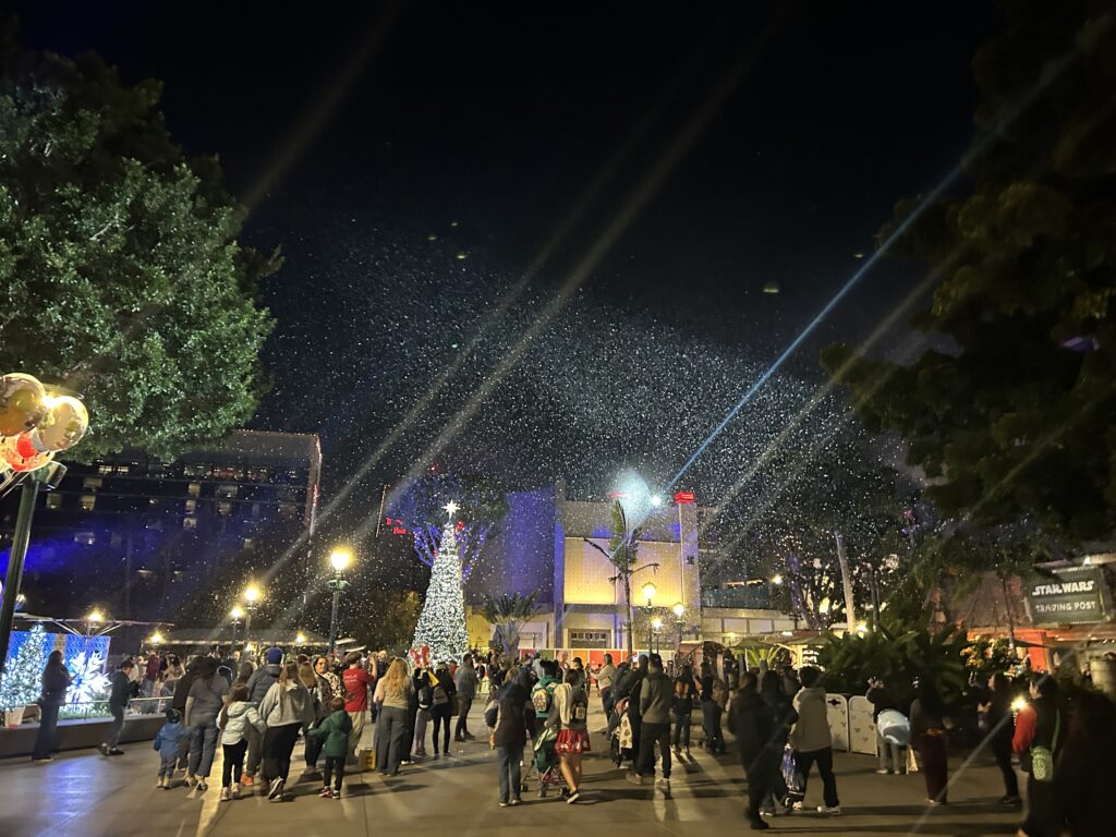 ツリーの周りは夜は雪の演出もあり綺麗!
