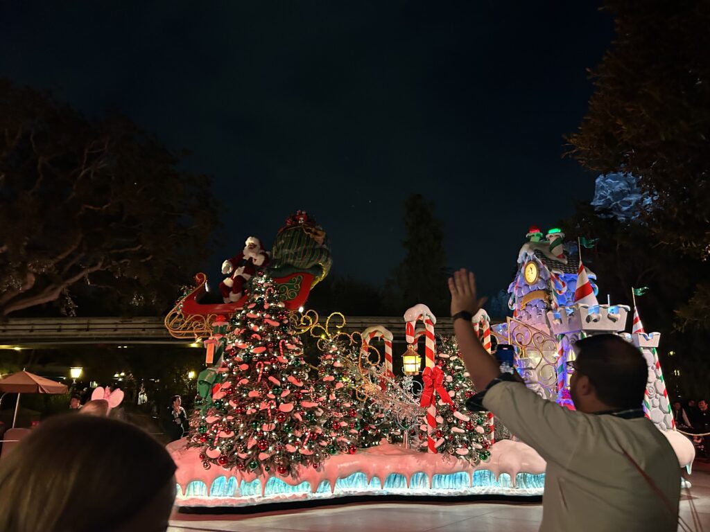 クリスマスのパレードは日中と夜とありますが、どちらも大混雑でした。でもラッキーなことに移動しながら見れてサンタさんも手を振ってくれました。近くで座ってゆっくり見たい場合には早めに場所取りするのがおすすめです。