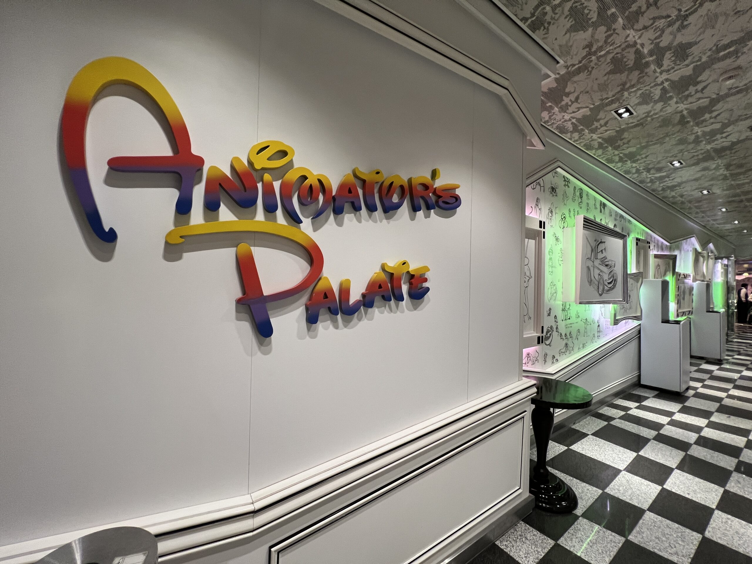白黒のスケッチからスタートし、食事が進むにつれてだんだんと色がつき、店内全体がカラフルに変化していく、ディズニー・クルーズラインを代表するレストランです。ウォルト・ディズニー・アニメーションへのオマージュが詰まっていて、壁一面のアートやスクリーンに映る映像も見どころ。料理だけでなく「ショーとしての体験」も楽しめます。