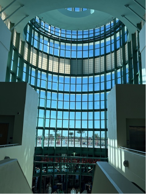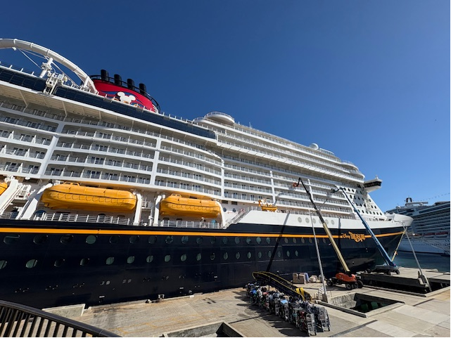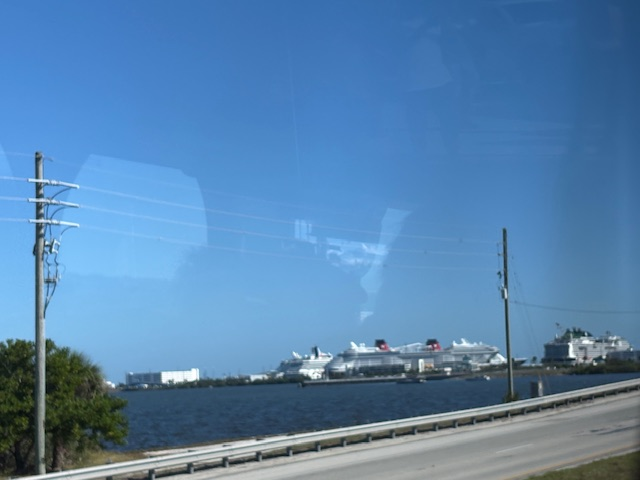 ウォルト・ディズニー・ワールドからポート・カナベラルまではおよそ1時間。乗船を控えているせいか、車内はワクワク感でとても賑やかでした。港が近づくと、左手にディズニーの豪華客船が見えてきます。この瞬間、「ついに船に乗るんだ!」と興奮が最高潮に。