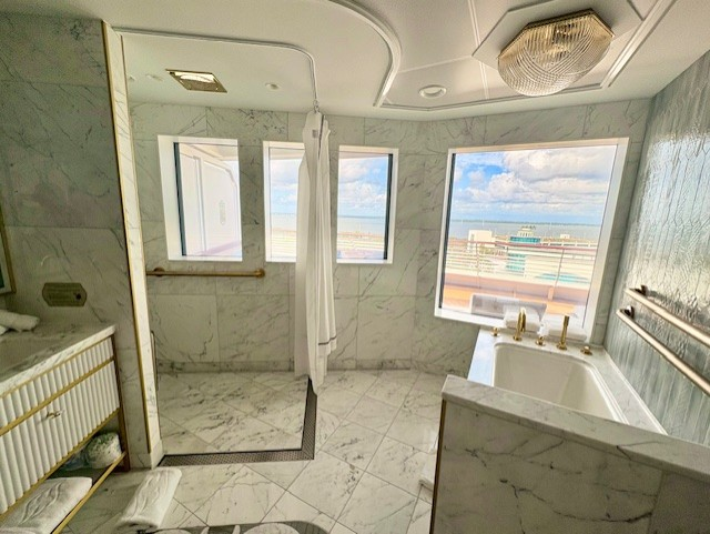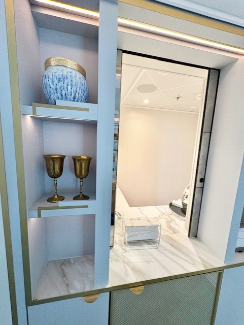 バスルームも複数あり、それぞれ大理石調のデザインや広々とした洗面スペースが備えられています。その印象は、もはや「船の客室」という枠を超え、高級ホテルのスイートルームそのもの。家族や友人と一緒でも快適に使える工夫がされています。