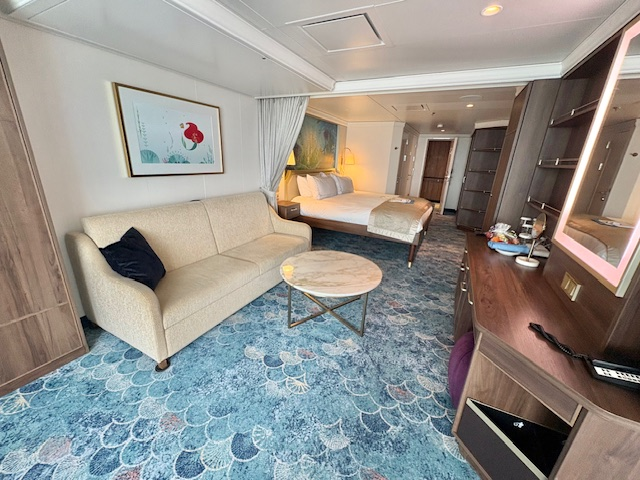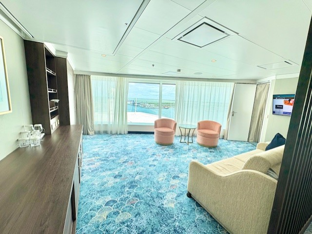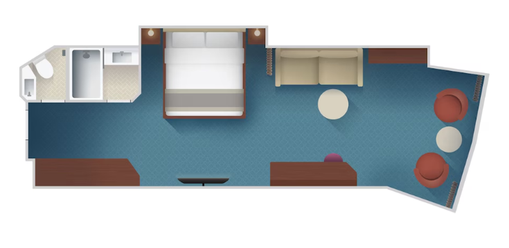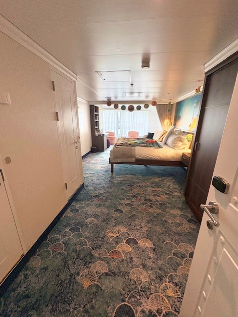 デッキ11の最先頭にあるお部屋で、同じ階には共用のプールデッキもあり、客室からすぐにアクセスできるため、プールやデッキで遊んだ後も便利に戻ることができます。
