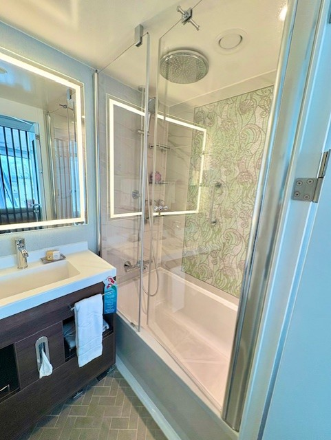 - 2ドアの「分割型バスルーム」片側:バニティ、洗面台、シャワー、浴槽兼シャワー/もう片側:バニティ、洗面台、トイレ