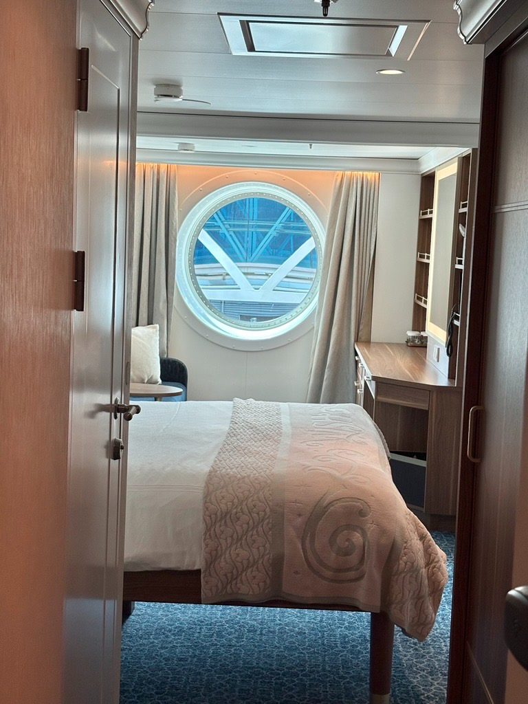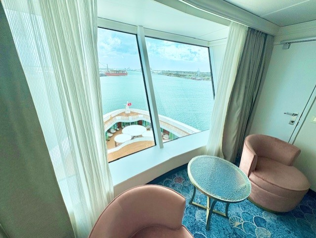 通常のオーシャンビュー客室では側面且つ丸窓が中心のため、先頭向きに一面に広がる窓はなかなか見られません。